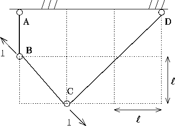 適当なつり合い系を考え,外力仕事を零と置く.簡単なつり合い系を みつけるのは容易ではないかもしれないが,例えば下図のように 部材 BC の両端にそれに平行な 2 つの外力を作用させたものは, 明らかにひとつのつり合い系である.
