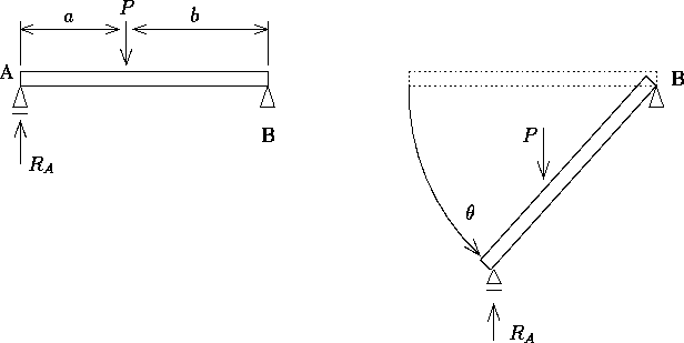下の図において,左支点 A の鉛直支点反力 を求めるのに, 有限な仮想の回転角 を与えても結果は正しく求まる. この場合,『微小』ではない仮想変位を与えても『仮想仕事の原理』が 成立するのはなぜか,その理由を考えよ.