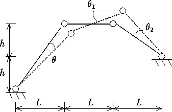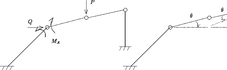 節点 A をヒンジ結合とし,代わりに を作用させた系を考える. 次にこの系のメカニズム運動を考え,前者を力学的許容系,後者を 運動学的許容系として「仮想仕事の原理」を適用すれば,次式が得られる.